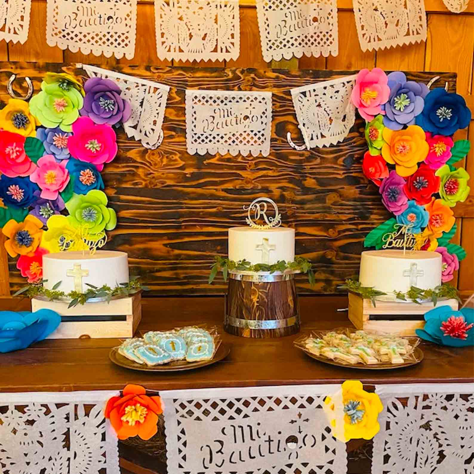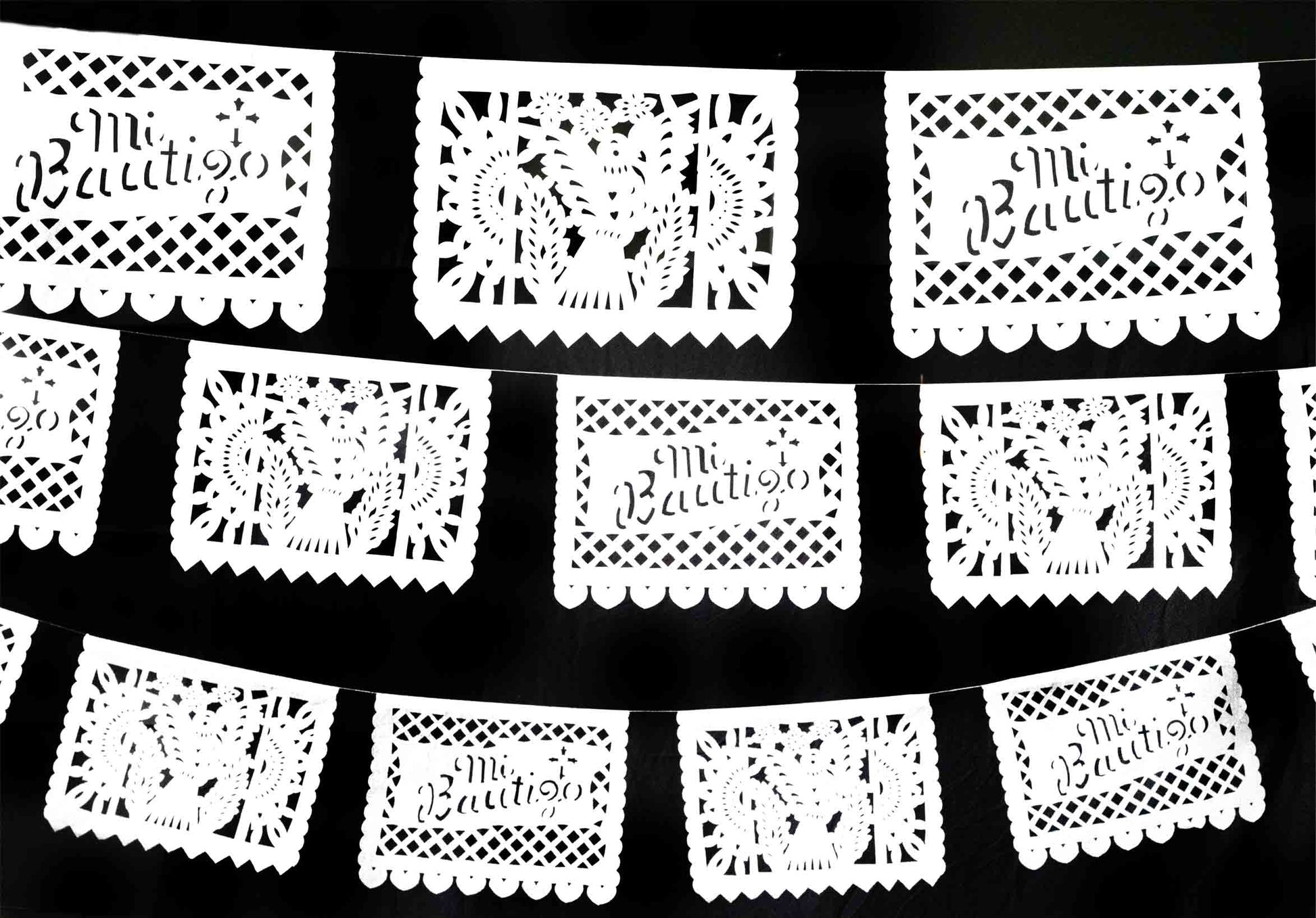 A beautiful garland for your baby's baptism fiesta! Our garlands have two images, one that says "Mi Bautizo" with a cross symbol and a dove image symbolizing purity and peace.